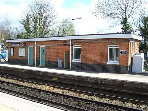 The goods shed, which had been used as a lost property store until around 1950, survived and was rented to Scottish & Newcastle as a distribution depot.[44] Until relatively recently, there was a staffed ticket office in a box on the up platform, adjacent to a surviving semaphore signal.[13][30][53][54]