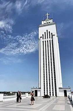 The church now features two towers: one is 70 meters high, and a lower one arises from the main altar. In the main tower's upper level there is an additional chapel. An elevator permits access to the church's roof, which affords a panoramic view of the city.