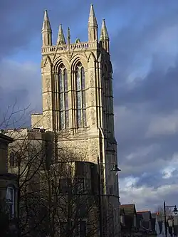 The Victorian church tower is of four stages with a short pyramidical spire and angle turrets. Since the fire in 1982, it has been extended, supplied with a lift and converted into a very unusual detached house called “Highland Tower”.[10] Because of its size and commanding position on the upper part of a steep hill, this tower is a notable landmark.