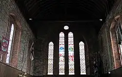 The cathedral on Ross Road is built on the site of Holy Trinity Church, which was destroyed by a peat slip that destroyed part of Stanley in 1886.[1] The new building was designed by Sir Arthur Blomfield and built in 1890–1892 from the local stone and brick.[3] It incorporates a tower with a ring of five bells, 19th- and 20th-century stained glass windows, and a two-manual pipe organ built in Ireland.[4] Bishop Waite Stirling consecrated the new cathedral on 21 February 1892.[1]