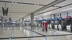 The main terminal building contains a combined check-in hall for domestic and international flights. It has 58 check-in counters, in addition to self-service check-in kiosks. A common baggage claim hall is also located on the ground floor.[42] There is a large retail area on the first floor, with many food and retail outlets as well as waiting areas. A major feature of the terminal is a $15 million state-of-the-art baggage handling system, which is 750 metres (2,460 ft) long.[43]