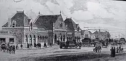 Facilities at the station were initially modest, consisting of a platform, station building, goods shed, locomotive shed, staff accommodation, a single main line and siding. It was not long before this proved to be inadequate, with an authorisation for the enlargement of the goods shed and the provision of a refreshment room forthcoming in January 1864. Later, the arrival of new locomotives resulted in the construction of additional locomotive storage, and the purchase of additional carriage stock necessitated the building of a new carriage shed. In October 1873, a new siding was laid and by 1874 a stores building with derrick had been added.[1]