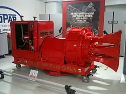 The final model of Chrysler Air Raid siren was produced by Chrysler from 1952 to 1957, as part of the United States civil defense system during the Cold War.[1] Its primary purpose was to warn the public of an impending nuclear attack by the Soviet Union.[2][3] The power plant utilized a Chrysler Firepower Hemi V8 engine with a displacement of 331 cubic inches (5.42 L).[1] The sirens are 12 feet (3.7 m) long and weigh an estimated 3 short tons (2.7 t), with six horns that are each 3 feet (91 cm) long.[1] A user starts the engine and, once it reached operating speed, pulls and releases a transmission handle to generate the signal.[1] The siren rotated on a turntable at 1.5 rpm. Unlike the Victory-Bell Siren, this siren could be operated remotely.