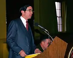 Robb was more liberal on social issues. He voted for the Federal Assault Weapons Ban[11] and against the execution of minors. He was opposed to a constitutional amendment to ban flag burning. In 1993, he supported Bill Clinton's proposal to adopt the don't ask, don't tell policy on homosexuals in the armed forces. Three years later, Robb was the only senator from a Southern state to oppose the Defense of Marriage Act.[12] In stating his opposition to the bill, which his friends and supporters urged him to support, he said the following, "I feel very strongly that this legislation is wrong. Despite its name, the Defense of Marriage Act does not defend marriage against some imminent, crippling effect. Although we have made huge strides in the struggle against discrimination based on gender, race, and religion, it is more difficult to see beyond our differences regarding sexual orientation. The fact that our hearts don't speak in the same way is not cause or justification to discriminate."[13] Some have speculated that his position on gay rights, along with his positions on other hot-button issues like abortion, alienated the generally conservative voters of Virginia and contributed to his eventual defeat.[14]