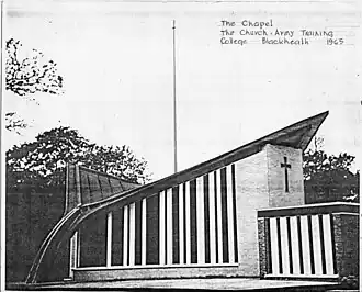 The foundation stone was laid in March 1964.[31] The chapel was part of the Church Army Wilson Carlile Training College designed by the same architect, and was opened by Princess Alexandra at 2.45 pm on 6 May 1965,[1][32][33] the opening being commemorated on a marble stone in a cloakroom off the entrance lobby to the chapel. The late R.G.D. (Russell) Vernon MBE,[34] head of Austin Vernon & Partners under whose banner the chapel was designed by E.T. Spashett, was invited to the opening at which the Archbishop of Canterbury Michael Ramsey was to consecrate the chapel.