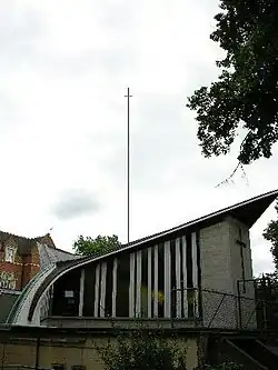 At Greenwich Council building conservation department[3] it is locally listed as a building of outstanding architectural significance, under the name of the Wilson Carlile Training College Chapel at 27 Vanbrugh Park, Blackheath, London, by architect E.T. Spashett. It is described as: "An interesting modern building of unusual design featuring a striking gull wing upper roof swept to ground level on one side; grey brick with tall, narrow window lights".[4] Local listings have no reference number. By the time Greenwich Council planning department assessed it in the 1980s, the spire was down and lying alongside the building. The building could not be upgraded to national status by The Department for Culture, Media and Sport, representing English Heritage[5] in April 1999, as the spire was gone so the massiveness of the roof structure could no longer be understood by the assessors who were puzzled to find it "overscaled".[6] When opened complete with spire in 1965, the South East London Mercury described the chapel as "a showpiece of modern architecture and building technique".[2]