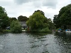 This inhabited islet connects by a footbridge to Church Street, Staines, adjoining The Lammas recreation ground and mini-golf course and 100m below the oldest of the town's three Anglican churches, a Grade II* medieval structure.[1] St. Mary's Church is on a small rise, elevated 5 metres above river level, and 21 metres above sea level, as such, from its steeple the island is visible. The island is 100m long and almost triangular, and rises no more than 1 metre above river level.[2] The narrow channel between the island and north bank (backwater) forms a small oxbow away from the course of the river.