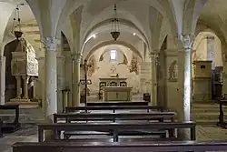 Two staircases, located to the right and left of the chancel, lead to the crypt that was part of the early church. The hall, structured on three naves, is divided into a front space, probably the oldest and dating perhaps to the 9th century, covered by three rib vaults supported by columns, and a rear part presumably contemporary to the construction of the upper church and also covered by cross vaults supported by wide pillars, almost all of which have an elegant abacus. To the east, the crypt concludes with three apses, made of simple unadorned masonry, placed in continuation of the three naves; the left and central basins turn out to be decorated with frescoes of which only a few traces remain, worn away by time and moisture; in particular, one can distinguish depictions of the Madonna and Saints and of the Annunciation and Visit of the Magi.[46][26] At the end of the middle nave is the 16th-century altar in polychrome marble.