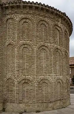 The church, with a design plan consisting of three naves and a horn, presents two distinct construction phases. It preserves both the apse and the brick anteapse from its original construction in the 13th century. The rest of the church's construction was rushed in the middle of the 16th century. The interior roofing, constructed to accommodate the new naves, was made with wood and attached to the apse. The bell tower was constructed by Juan de Ballesteros.