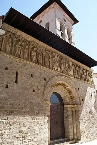 The sculpted frieze above the doorway shows Christ Pantocrator sitting in majesty within a mandorla, typical of Romanesque sculpture. He is surrounded by the symbols of the Four Evangelists, the Tetramorph. On each side of the Christ, the Apostles stand under small multifoil arches. This frieze is likely the work of two different sculptors.[1] The result are highly plastic sculptural compositions with their dramatic gestures and arrangements, their expressive use of texture and line. In these sculptures deep undercutting and effusive drapery establish an expressiveness that is at once moving and exhilarating[2]