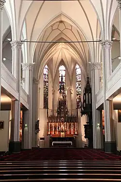 De Papegaai is the lesser of the two parochial churches in the St Nicholas Roman Catholic parish in Amsterdam. The church is dedicated to Saints Peter and Paul. It is nicknamed "De Papegaai" (The Parrot) because it was originally hidden in a garden behind a regular housefront that belonged to a bird-trader in the days when Catholicism could not be practised publicly. Today there is a narrow, Neo-Gothic facade flanked by statues of Saint Joseph and a perched parrot. The church is on the busy Kalverstraat just south of Dam Square, and invites people in for quiet, as well as celebrating Sunday Mass (Post-Vatican II Mass) in Latin with Gregorian chant.
