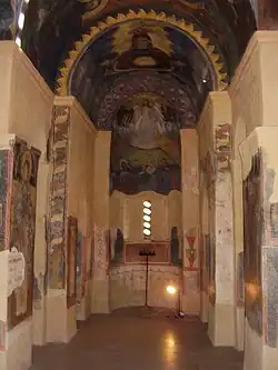 The church's interior has preserved a number of medieval frescoes, particularly in the lower reaches of the walls and pillars. The paintings in the altar were done in the 11th–12th century, while the decoration of the pillars dates to the 12th century. All inscriptions that accompany the murals are in Medieval Greek. The altar features the images of four deacons bearing a censer and monstrances as well as two bishops who could possibly be identified as Basil of Caesarea and John Chrysostom. A number of saints are also depicted inside the church, including Saint Elijah, Saints Cosmas and Damian, Saint Hermolaus, Saint Pantaleon, and four unidentified female saints.[5] There are also later works of art in the church. It boasts icons or murals by painter Ivan Dospevski from 1881 as well as works by Mihail Belstoynev.[6]