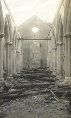 On 30 September, 1908, during soldering work on the lead roof, the church caught fire. The fire spread quickly and by the time it was extinguished, only the walls remained standing; the church a smoking ruin. The majority of the 1732, 1852 and 1887 fittings were destroyed, including most of the stained glass, the organ, church bells and woodwork. Only a few fittings were able to be rescued and the monuments that did survive, such as the font, were severely damaged.[2][3][5][6][8][9]
