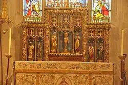 The Trinity Chapel dates from 1430 to 1460 and was endowed for a priest of the nearby Abbey to say masses for the souls of Kings and Queens.[7] It contains a squint which enabled the priest to synchronise the celebration of mass with that at the high altar.[8] The nave was completely rebuilt between 1515 and 1530 and is a remarkable example of late Perpendicular Gothic architecture.[9][6] The tower is fifteenth century and remarkable for the large buttresses which shore it up at its junction with the nave.[10] The great south porch which adjoins the market place was built around 1500 at the expense of Alice Avening.[11] It is elaborately decorated. It was built by Cirencester Abbey around 1480, as an administrative centre and only connected to the church in the 18th century. Between the dissolution of the monasteries and its connection to the church it was used as the town hall.[4][3] The nave was again rebuilt between 1516 and 1530.[2]