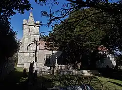 The nave may be 11th century,[2] as may be the Norman font.[3] A north aisle was added at the end of the 12th century and a south aisle shortly afterwards.[2] In the 14th century the chancel was rebuilt and the south porch was added.[2] In the 15th century a chapel was added south of the chancel and east of the south aisle, and a four-centred arch was inserted in the south wall of the chancel to link it with the chapel.[2] The north aisle was demolished, its arcade filled in and two-light Perpendicular Gothic windows inserted in each of the filled-in arches.[2] The Perpendicular Gothic[3] west tower was added towards the end of the 15th century.[2] The square-headed windows in the south aisle were inserted in the 16th century and the spire was added to the tower probably early in the 17th century.[2]