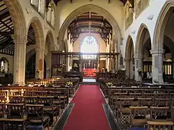 There is a chancel, a nave of five bays, north aisle, and modern south porch. With the arrival of the British Army in the area in the early 1850s the church proved to be too small for the sudden influx of residents, and the building was extended in 1859. The nave was restored and the north aisle added in 1868, so that the tower, the chancel and the Lady Chapel extension of 1380 are the only ancient parts of the original church to survive.[2] The main door to the original church is today the one giving access to the tower. The so-called 'Lady Chapel' is in fact the original church and arches to its left were once the outer wall.[16] In 1912 a new nave, chancel, and North arcade were added to a design by Sir Thomas Jackson, R.A.[17]