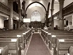 The first organ in the church was fitted in 1829,[24] but the current one was installed in 1892, being built by J. Binns of Bramley, Leeds.[25] The organ is recognised as being of national interest, and is registered by the British Institute of Organ Studies (BIOS) with a grade II certificate.[26][27] The bells and clock were restored in 1912, and an opening ceremony was performed by the Bishop of Knaresborough.[28] The bells have been described as being "..a splendid peal of musical bells, whose mellow tones are heard to great advantage..."[29] The Ring O' Bells public house at the western end of Kirkgate is so named on account of it being in a place to adequately hear the bells of the church.[30] A listing from 1879 describes eight bells, with the tenor bell weighing 15 long tons (15 t).[31][32]
