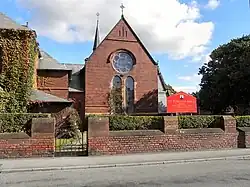 The presbytery is joined to the north side of the church, and has a square plan with a lean-to porch on the south side. It is built in brick with a hipped slate roof, and is in two storeys with attics. The two-bay west front contains a canted bay window on the right, a three-light mullioned window to the left, and two similar three-light windows in the upper floor. On the west and south sides are dormers with hipped roofs and finials, and on the apex of the roof is a cruciform chimney stack.[3]