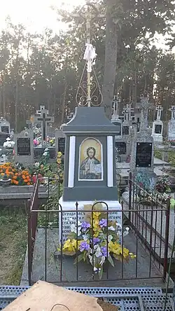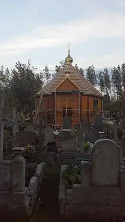 From 1922 to 1939, the church was particularly cared for by Alexander Szum, the founder's grandson.[1] According to various sources, the church survived World War II without damage[1] and did not require major repairs afterward.[2] Several years after 1945, extensive renovation work was undertaken by the parishioners (including the Szum family) and the vicar of the Orthodox parish in Siemiatycze, Father Grzegorz Sosna. During this period, the shingle roof was replaced with eternit and later with metal. The foundations were secured, the floor and ceiling were replaced, and the interior was paneled with oak. The church was electrified, and copper candleholders and religious paintings were added, created by R. Brzeski, a painter from Siemiatycze.[2] Wiera Nieroszczuk from Kleszczele made a new Golgotha and Resurrection of Christ for the church.[1] The church also acquired additional sets of liturgical vestments, and the altar and prothesis crosses were gilded. The bell tower and bells were renovated, although only one bell remained usable (the other two were damaged). The renovation was entirely funded by the local Orthodox community.[2] From 1973, the church was cared for by another member of the Szum family, Włodzimierz, the great-grandson of the founder.[1]