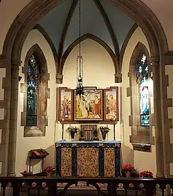 The high altar is made of Caen stone and was installed in 1905.[12] In 1929 the artist and parishioner George Fort Gibbs created seven paintings for the high altar's reredos as a memorial to his parents. The center panel is a Virgin and Child flanked by panels depicting other figures from the Christian era and Old Testament: Saint Francis of Assisi, Saint Peter, King Saint Edward the Confessor (last king of the English House of Wessex), Moses, Aaron, and King David.[11]