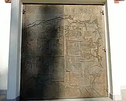 In the middle of the church stands a large two-sided commemorative bronze door, realized by sculptor Jacek Kucaba. It has been consecrated on October 19, 2009, by Cardinal Józef Glemp. On the inside, the carved scenes commemorate the life and mission of Blessed Father Jerzy Popieluszko (ordination, preachings, last Holy Mass in Bydgoszcz, kidnapping, torture and funeral). On the outside are paintings entitled "Roads to Freedom 1945-1989", depicting the uprisings and the church-led road that guided Poles to freedom.[7]
