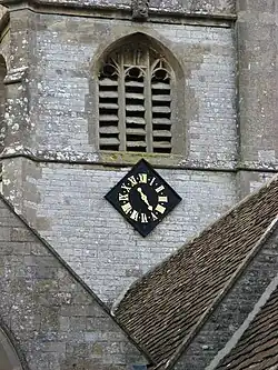 It has a three-stage west tower, supported by diagonal buttresses.[1] The tower is 61 feet (19 m) tall.[4] On the tower is a clock face with a single hand.[5] It contains six bells these were recast from the original five by Thomas Bilbie of the Bilbie family of Chew Stoke in 1741.[4] The tower is separated from the nave by a wooden screen erected in 1909.[5]