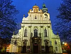 Rich Baroque motifs adorn both church interiors and façade: cartouches with writings, volutes, flaming vases, putti, rococo painting ornaments, and festoons.[9] The portal displays richly decorated stone statues of Saint Peter and Saint Paul. The transept boasts columns heaving balconies with statues of angels.[2]