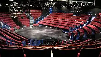The Circle contains a thrust stage, with seats surrounding it on three sides,[12][13] similar to the venue's off-Broadway predecessors.[14] It is one of two Broadway houses with a thrust stage; the other is Lincoln Center's Vivian Beaumont Theater. Because of the stage's unconventional design, theatrical critics negatively reviewed it, while directors had difficulty staging productions there.[15] Conversely, the design allowed the audience to be extremely close to the stage, as there were only ten rows of seats.[16] According to Mann, the design of the current Circle in the Square was based on the predecessor theaters. These, in turn, were based on a recommendation from theater critic Brooks Atkinson, who had told Mann: "When you walk in the door, you should see the stage—that should predominate—not the audience."[1]