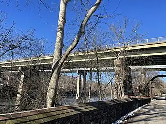 The City Avenue Bridges are twin bridges that span the Schuylkill River in Philadelphia, Pennsylvania. Although the bridges carry the eastbound and westbound lanes of City Avenue, the bridges are not signed with the U.S. Route 1 designation. The bridges directly connect the Schuylkill Expressway to Lincoln Drive, Kelly Drive, and Ridge Avenue via the Gustine Lake interchange.[1][2]