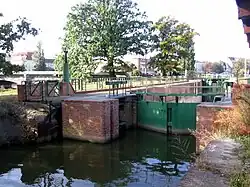City Lock[9] | South Oder – bypass canal | Chamber lock | 1794 (rebuilt 1879, 2000) | Dimensions: 42.8 × 5.3 m (140.4 × 17.4 ft); Gates: Mitre gates |