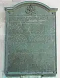 The central archway is about 8 m (26 ft) high and 5 m (16 ft) wide, with the city's coat of arms worked into the metalwork lunette above the gates. The smaller side arches are about 6 m (20 ft) high and 2.5 m (8.2 ft) wide. Carved into the stone above the side arches are the dates "1914-1918" (left) and "1939-1945" (right). The frieze above the central arch is inscribed with the Latin motto from the City's coat of arms, "VIVIT POST FUNERA VIRTUS", which may be loosely translated as "virtue outlives death", above which there is a carving of the city's coat of arms on the parapet. The interior walls of the archway have bronze plaques with inscriptions, including one inscribed with the words of tribute that the French Marshal Foch gave to the Sherwood Foresters in 1918.
