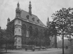 The Victoria Embankment building, a grand building said to be in the Italian Renaissance style but actually in a high Victorian style with a steep pitched roof resembling that of a French chateau, was designed by Davis and Emanuel and constructed by John Mowlem & Co. at a cost exceeding £100,000 (about £11,158,064.52 in 2016).[8] The designers designed the school as "amazingly unscholastic, rather like a permanent Exhibition Palace."[12]