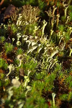 Cladonia carneola or the crowned cup lichen[3] is a species of fruticose, cup lichen in the family Cladoniaceae. It was described as a new species by Swedish mycologist Elias Magnus Fries. Lichenicolous fungi that have been recorded growing on Cladonia carneola include Phaeopyxis punctum and Taeniolella beschiana.[4]