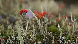 As a pioneer species, C. floerkeana often establishes early in succession, forming part of a characteristic "cup lichen" community.[17] These adaptations enable it to occupy niches too harsh for vascular plants or mosses, reducing competition in these environments.[19] The podetia show a high degree of variability, ranging from entirely decorticate surfaces to densely squamulose ones, allowing the lichen to adapt to a wide range of environmental conditions and substrate types.[7]