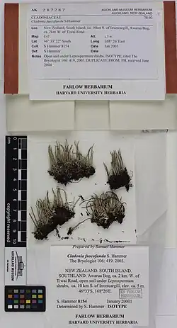 - ^ a b c Hammer, Samuel (2003). "Notes on Cladoniaceae in New Zealand". The Bryologist. 106 (3): 410–430. doi:10.1639/06.