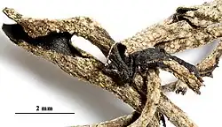 The upper portions of the branches also have distinctive features. The terminal and near-terminal branches have a relatively rough surface texture with a felty but loosely fibrous covering, and they typically taper gradually to pointed tips.[9] The branch tips are notably darkened and strongly deflexed to one side.[14] The internal structure of the branches consists of several layers: the wall measures 225–275 micrometres (μm) in thickness, with a delicate cobweb-like surface layer (called the arachnoid layer) of 25–50 μm.[6] One additional identifying feature is the red colour of its reproductive structures (called pycnidia), though this characteristic is rarely visible and can be difficult to observe in the field.[9]