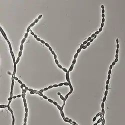 Cladophialophora bantiana exhibits predominantly hyphal growth both in vivo and in vitro.[5] The normal morphology consists of dark coloured largely unbranched, wavy chains of conidia, individually 5–10 μm in length.[5] The dark colour is due to the presence of the dark pigment melanin.[6] Hyphae are septate, as is the case for species belonging to the phylum ascomycota.[1] In samples isolated from cerebral tissue compared to cultured samples, a predominance of unbranched conidial chains and absence of conidiophores has been reported.[5][6] In culture, the colony is black with a velvety texture or dark grey in colour, depending on the type of agar medium it is grown on.[2] Cladophialophora bantiana has been reported to grow in culture under temperatures ranging from 14-42 °C with optimal growth around 30 °C.[2] Cladophialophora bantiana grows slowly in vitro, taking ~15 days to mature when grown at 25–30 °C.[1] Cladophialophora bantiana can be distinguished from other species of the genus Cladophialophora by the presence of the enzyme urease.[7]
