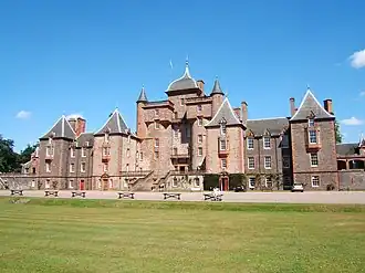 The only son of John Maitland, 1st Lord Maitland of Thirlestane was created the first Earl of Lauderdale in 1616.[3] John Maitland, 1st Earl of Lauderdale was President of the Council and a Lord of Session.[3] His son was John Maitland, 2nd Earl of Lauderdale who was created Duke of Lauderdale in 1672.[3] The Duke had fought for Charles II of England at the Battle of Worcester in 1651 where he was captured and imprisoned in the Tower of London for nine years.[3] After the Restoration he had risen to become the most powerful man in Scotland and was created a Duke in 1672.[3] However he was also the first and last Duke of Lauderdale.[3] The Duke employed Sir William Bruce to convert his Thirlestane Castle into a renaissance palace.[3]