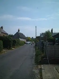 The main part of the village is known simply as The Street, a single long dead-end road coming off the A280 and containing the majority of the village's housing. The Street is also home to the local school and, up a slight incline into the woods, the Church of St Mary the Virgin, a 12th-century building. The houses of The Street are a combination of 1930s council houses, much older original village cottages and post-Second World War bungalows in some of the new closes.