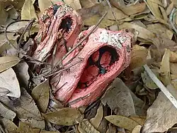 A considerable variation in height has been reported for the receptacle, ranging from 5 to 20 cm (2 to 8 in) tall.[7][23] The base of the fruit bodies are attached to the substrate by rhizomorphs (thickened cords of mycelia). The dark olive-green to olive-brown, foul-smelling sticky gleba covers the inner surface of the receptacle, except near the base. The odor—described as resembling rotting meat[25][26]—attracts flies, other insects, and, in one report, a scarab beetle (Scarabaeus sacer)[27] that help disperse the spores.[3][28] The putrid odor—and people's reaction to it—have been well documented. In 1862 Mordecai Cubitt Cooke wrote "it is recorded of a botanist who gathered one for the purpose of drying it for his herbarium, that he was compelled by the stench to rise during the night and cast the offender out the window".[29] American mycologist David Arora called the odor "the vilest of any stinkhorn".[3] The receptacle collapses about 24 hours after its initial eruption from the egg.[7]