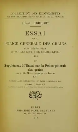 - Essai sur la police générale des grains, sur leurs prix et sur les effets de l'agriculture. Collection des économistes et des réformateurs sociaux de la France (in French). Paris: Paul Geuthner. 1910 [1755].