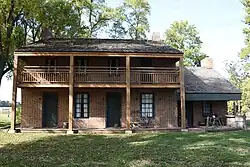 The Broadwell Tavern was built in 1824 by innkeeper and land developer John Broadwell as an investment in the Springfield area. The businessman sensed that the nearby county seat of Springfield would grow and its residents would need to travel in and out. On the American frontier in the 1830s, a tavern typically doubled as a logistics center. The drivers of slow-moving, horse-drawn drays needed a place to spend the night where their horses could be fed and watered. Illinois law required taverns to provide these services as condition of receiving a license to serve alcohol by the drink. Although the hospitality of the Broadwell Tavern was never luxurious, the tavern's fireplaces kept the brick tavern warm, and glass windows helped encourage the guests to get up early and resume their journeys. The tavern was built in a vernacular Federal style, similar to English country inns.[2][3] It is the oldest brick building in Sangamon County.[3]
