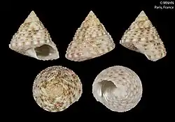 The size of the shell varies between 9 mm and 15 mm, with a tiny protoconch of less than one whorl and a teleoconch up to 7-8 whorls. The sculpture on the spire whorls consists of beaded spiral cords as wide as interspaces; one cord running just above the suture and continued on the peripheral angle of the body whorl is a duplicate with adapical component strongly beaded and abapical one less so. The abapical surface is imperforate, slightly convex and bearing 6-10 spiral cords, as wide as interspaces and not beaded. The shell colour varies from whitish to yellowish, with nacre showing through in some cases, broad brown flames starting from the suture on the early spire whorls; later whorls usually contain cords and a peripheral rim white articulated by white and brown streaks. The abapical cords also articulated by smaller white and brown flecks.[2]