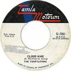 "Cloud Nine" is a 1968 hit single recorded by The Temptations for the Motown label.[3] It was the first of their singles to feature Dennis Edwards instead of David Ruffin in the lineup, was the first of producer Norman Whitfield's psychedelic soul tracks, and won Motown its first Grammy Award. The song was written by Whitfield and former Motown artist Barrett Strong.