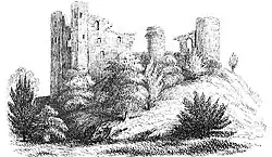 On the highest point of the main motte are the remains of one wall of what appears to have been an earlier small square keep, probably dating from the 11th or 12th century. The remains of a bridge, linking the main motte with the south-west mound, can just be seen to the south of this; this bridge would have formed the main route to the town.[8] South of the bridge is the site of the gatehouse, while the foundations of a great round tower can be seen to the south-west. Along the west front are the remains of two solid turrets, built in possible imitation of Château Gaillard. A number of domestic buildings once stood inside the main bailey, including a grange, a stable and a bakehouse.[9] The earthworks of two further bailey walls can be seen on the east side of the castle.[8]