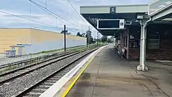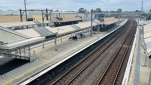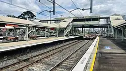 ![]() Eastbound view showing platforms, shelters and buildings, October 2022 | ||||||||||||||||