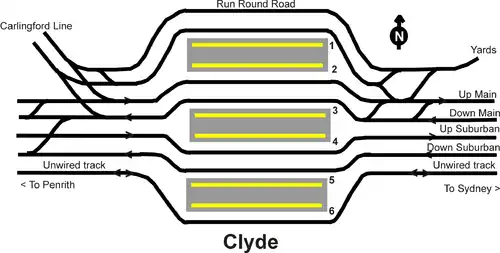 On 17 November 1888, Clyde became a Junction station with the opening of the Carlingford line to Rosehill. As part of the Parramatta Light Rail project, the Carlingford line closed on 5 January 2020.[5]