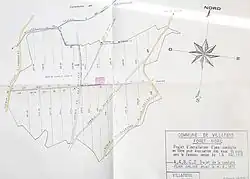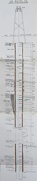 Shaft No. 1 was constructed in 1826 and reached a depth of 11 meters below the surface,[22] where coal deposits were encountered. Subsequently, the shaft was extended to a depth of 12 meters. This shaft was situated to the east of the future saltworks, at a location designated as Chintres-du-Chanois.[23] The shaft was timbered with a rectangular section measuring 2.65 meters by 1.32 meters. It was abandoned in January 1833 due to excessive water infiltration.[24] It was subsequently restarted in July after the dewatering of the works.[25] In November 1834, the shaft was divided into three compartments (two for extraction, one for personnel) by two wooden partitions.[22]