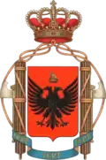 Great/lesser arms of the Kingdom of Albania (1939–1943) On 3 June 1939, his Majesty the King Emperor, surrounded by his civil and military entourage, placed the «Constitutional Charter» into the hands of the President of the Ministerial Council, Vërlaci, expressing the paternal solicitude and affection for the Albanian people which inspired his determination. The said "Charter", made up of 54 articles grouped into 7 Titles, makes no mention yet of a coat of arms.[21] The arms of the Kingdom of Albania were promulgated by royal decree nr. 141, dated 28 September 1939. Summarized in seven article paragraphs, they are described as follows:[22] The greater arms is used: in the great seal of the State, on solemn occasions and in monumental decorations.