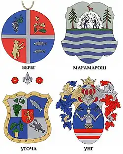 The arms is parted per pale show three gold bars on blue field in its first (dexter) field and a red bear rampant on silver in its second (sinister) field.[1] In 1924 Czech professor Irži Kralj, a specialist of ethnography expressed his opinion that the bear is a symbol for the Carpathian wildlife (fauna).[3][1] For sometime it was thought that professor Friedrich was mistaken about existence of bear in heraldry of Uzhhorod or its vicinities, yet in 1991 a Polish economist Andrzej Wociał who was interested in history of wars proposed a version that bear may have derived from old heraldry of Peter Petrovics coat of arms who was an overlord of Zemplin and Ung in the 14th century.[1] There also was found an old seal from Ung county (megye) belonging to village of Kostrino which starts with inscriptions "Ung. M." and then another "Kostrina".[1] On the Kostrino village seal is depicted a bear rampant.[1] On the coat of arms of Bereg County is also depicted a bear rampant, but it is a bear rampant to sinister ("facing left").[1]